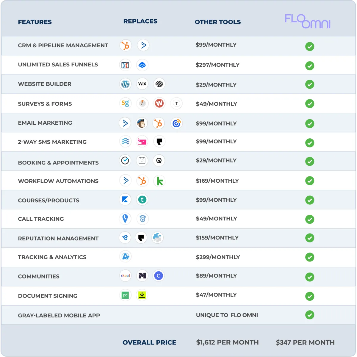 Yes! Flo Omni consolidates tools like Calendly (scheduling), Mailchimp (email marketing), DocuSign (contracts), QuickBooks invoicing, and even review software into one streamlined system. That means fewer logins, lower costs, and better results.
